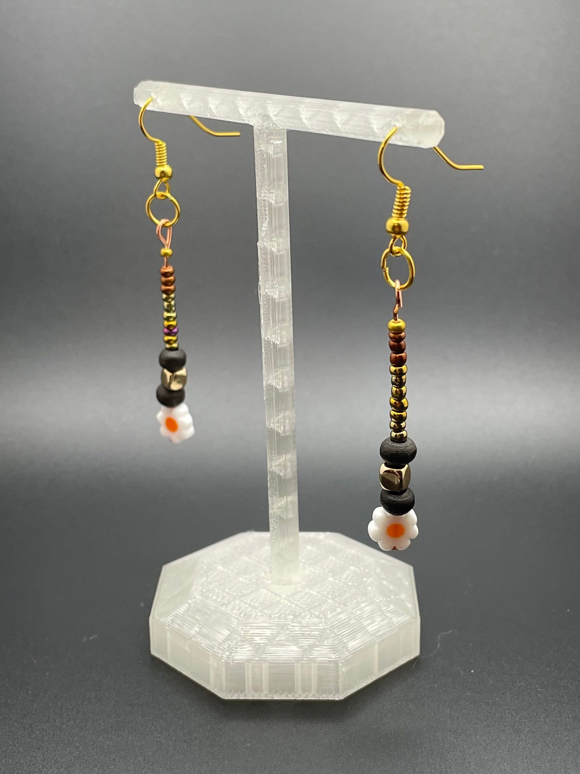 These daisy earrings have just the right amount of vintage flair to be interesting and unique, but are also simple, elegant, and fun! Long and thin beaded drops end with cute glass daisy beads. The jewelry is gold-toned.
