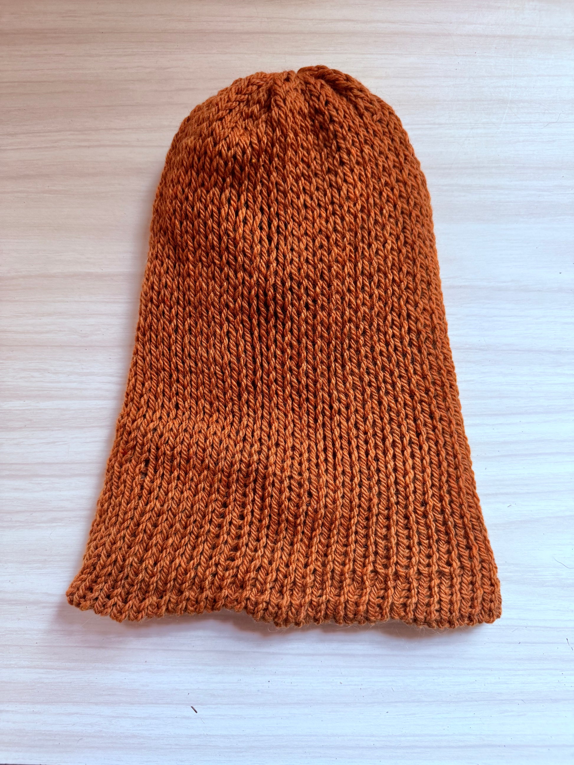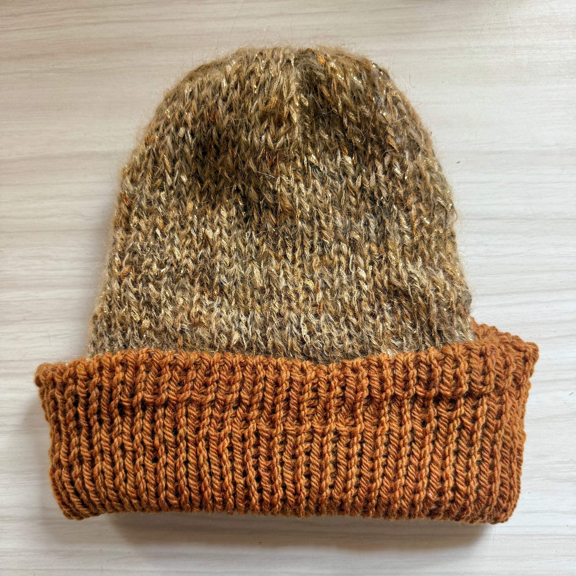 Handmade beanie that is made wool, mohair, and acrylic yarn, shown unfolded and with a folded brim. This beanie has an inner side made from 100% superwash merino wool for next-to-skin softness, with an outer layer made from fuzzy gold novelty yarn (mohair and acrylic)