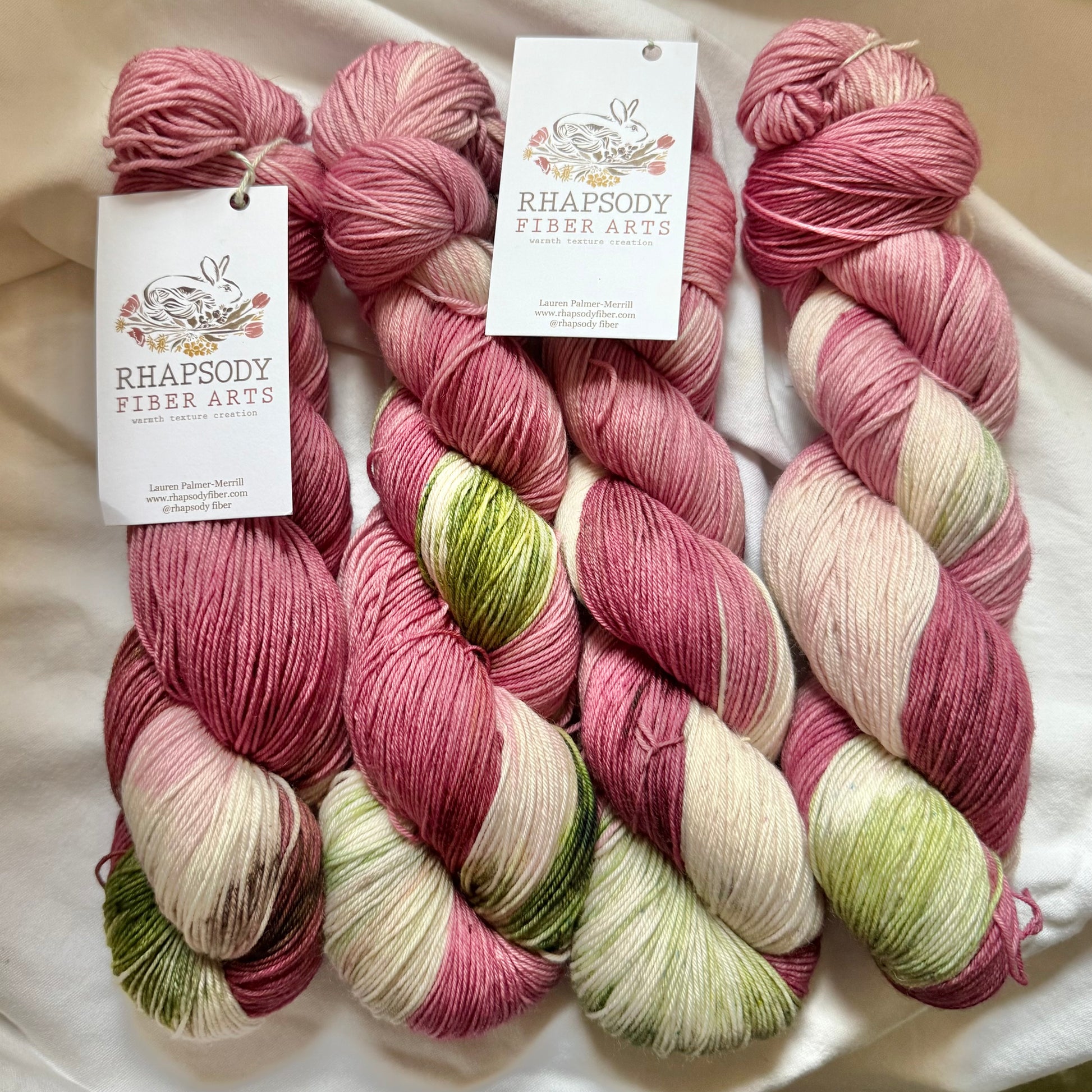 Cherry Blossom is a soft, beautiful colorway inspired by the Flowering Cherry Tree in the front yard of my house growing up. It is variegated a deep cherry blossom pink with green and white, and brown speckles for a little interest.