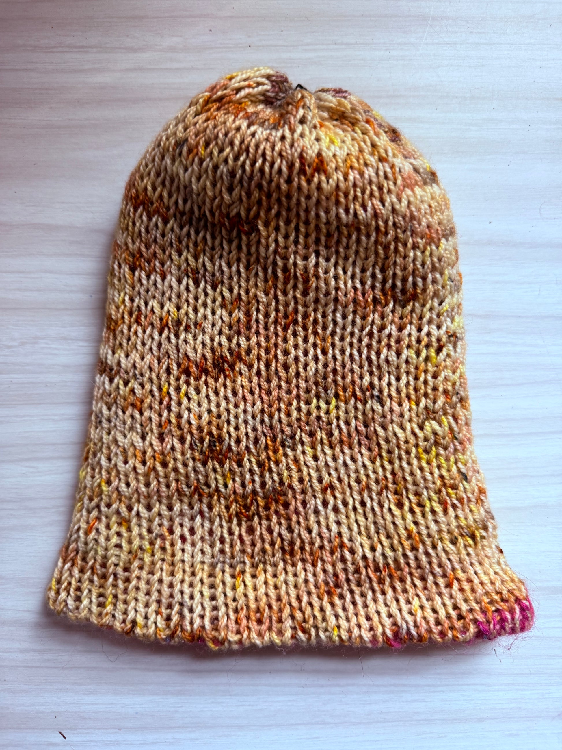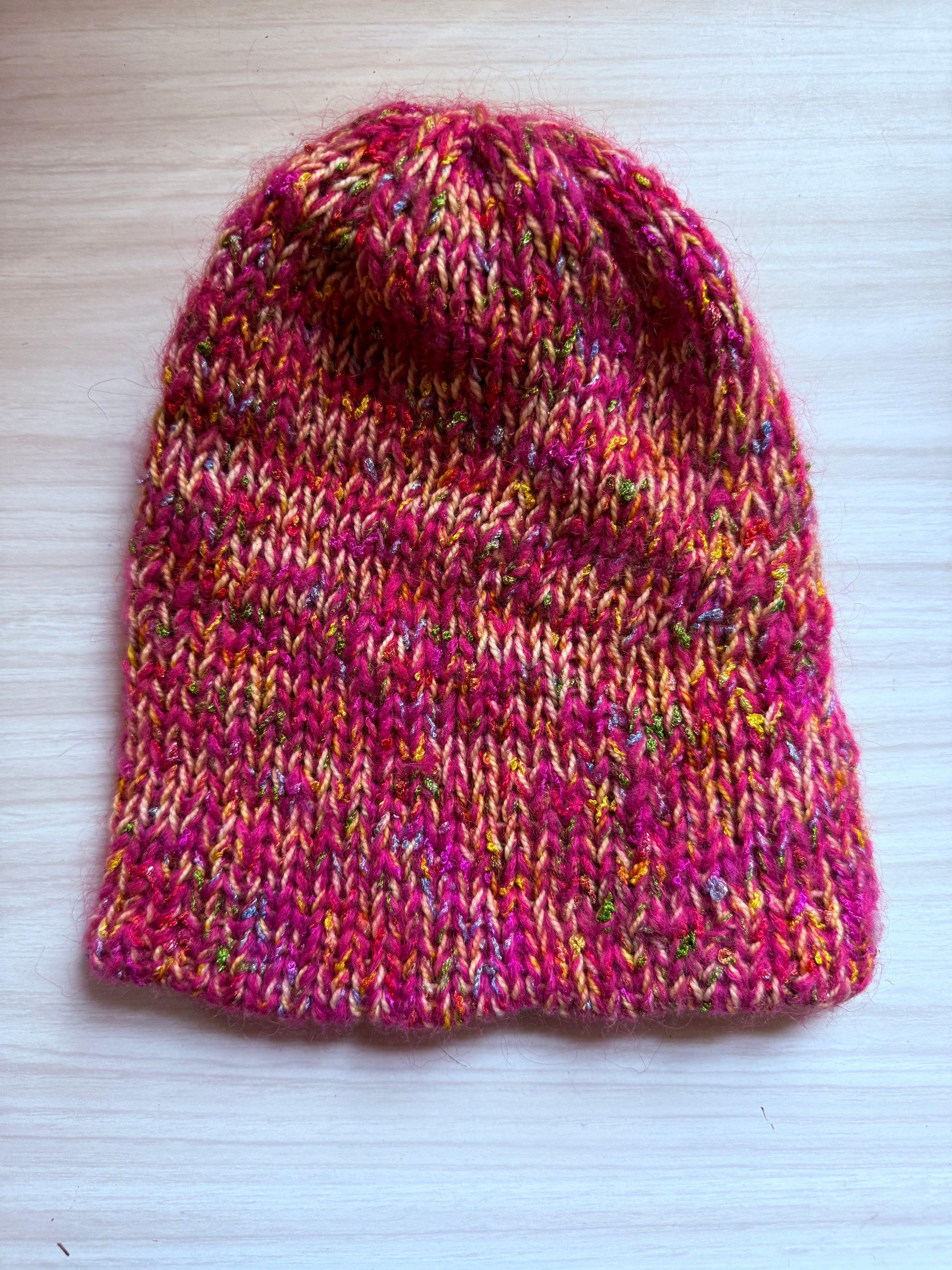 Handmade beanie made with pink and multi-colored fuzzy novelty yarn (outer) and soft merino wool yarn (inner.).