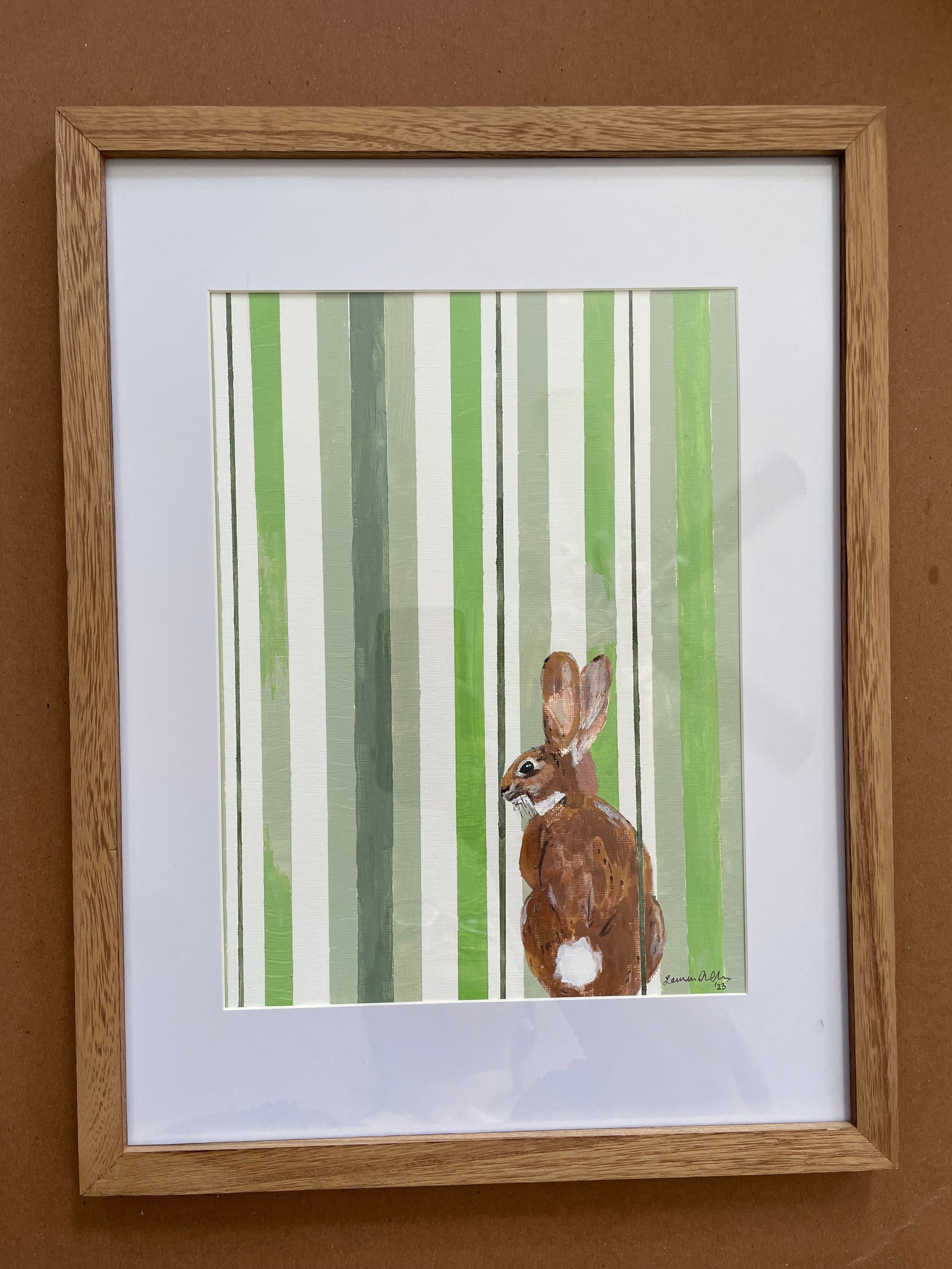 Curious Cottontail is the first piece in my woodland critters collection. The original piece is acrylic paint on paper. A native rabbit looks over its shoulder with ears at attention, waiting to hear the secrets you keep. The rabbit is place over a painted stripe background. This piece would make an excellent addition to a nursery or kid's room, or just a whimsical piece anywhere you see fit.