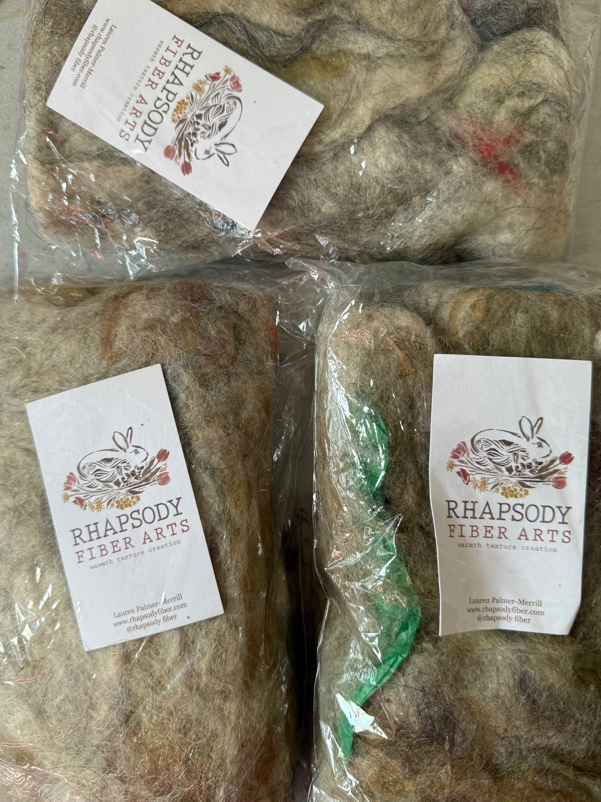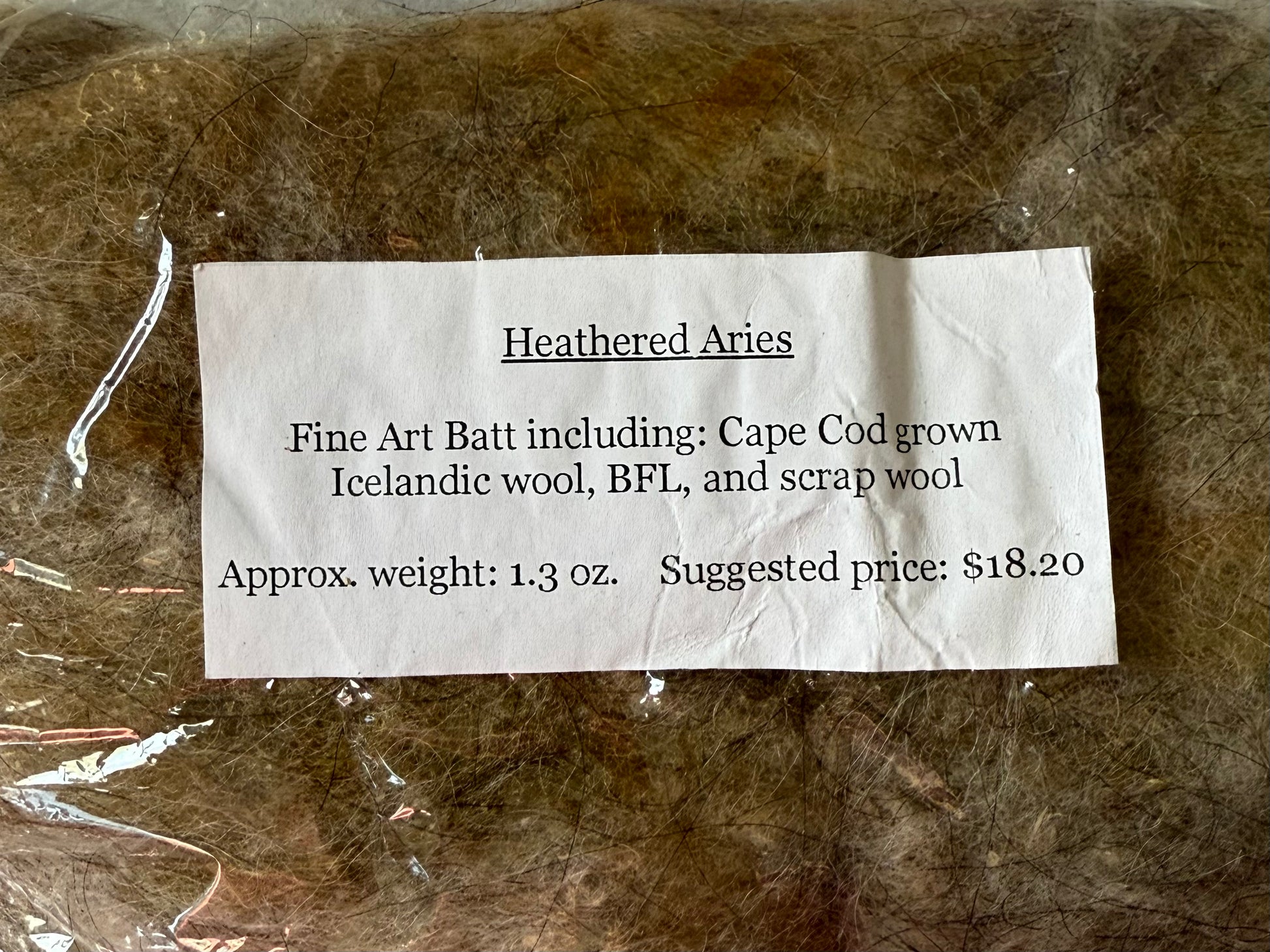 Heathered Aries batts are carded from Cape Cod grown Icelandic wool mixed with various colors of dyed BFL top and scrap wool. We pay homage to the Icelandic ram Aries for the gift of his wool, grown with love on my aunt and uncle's farm. The wool is farm-fresh and smells like a sheep in a serious way! This batt would coordinate well with Pinked Aries.