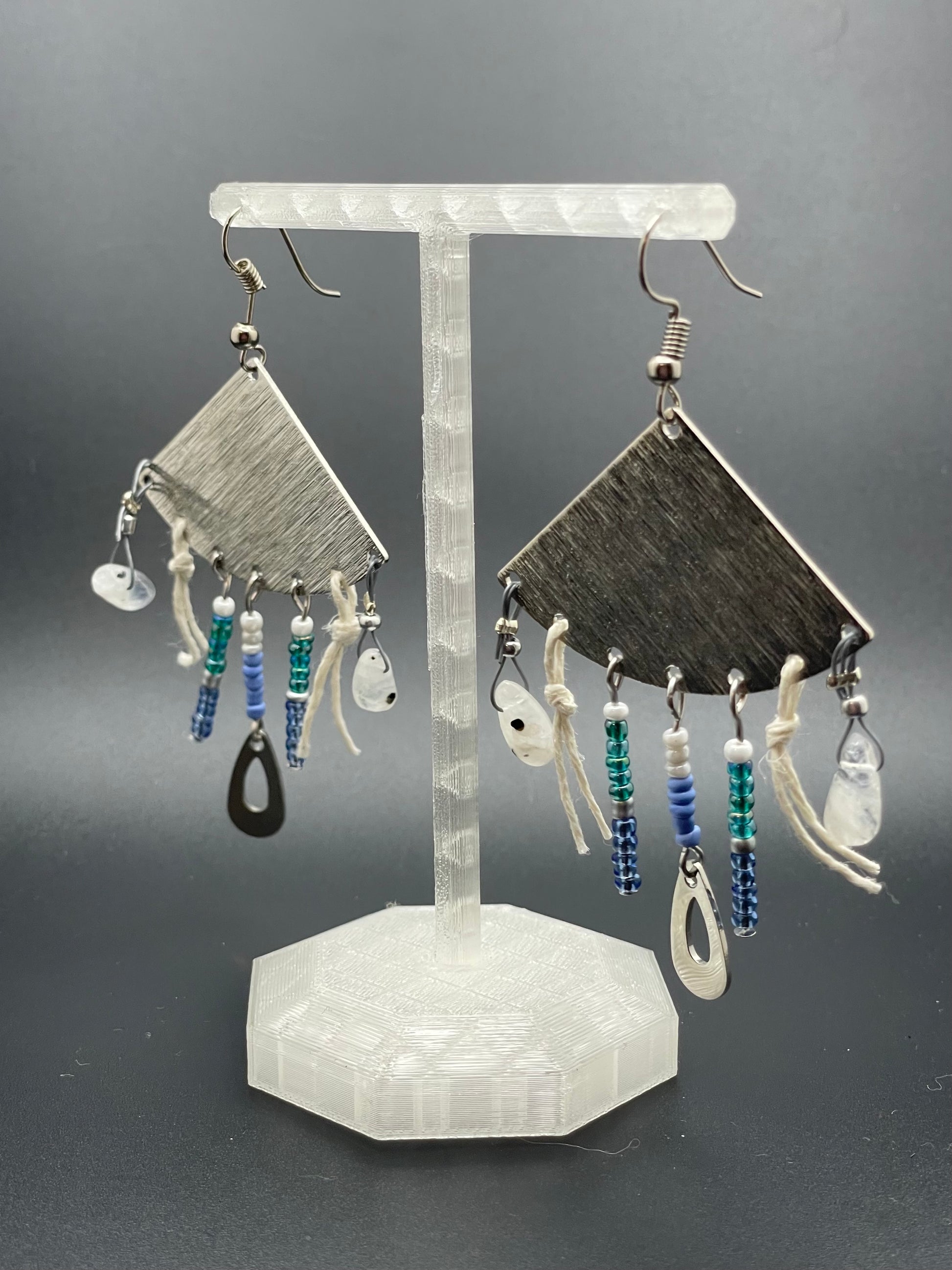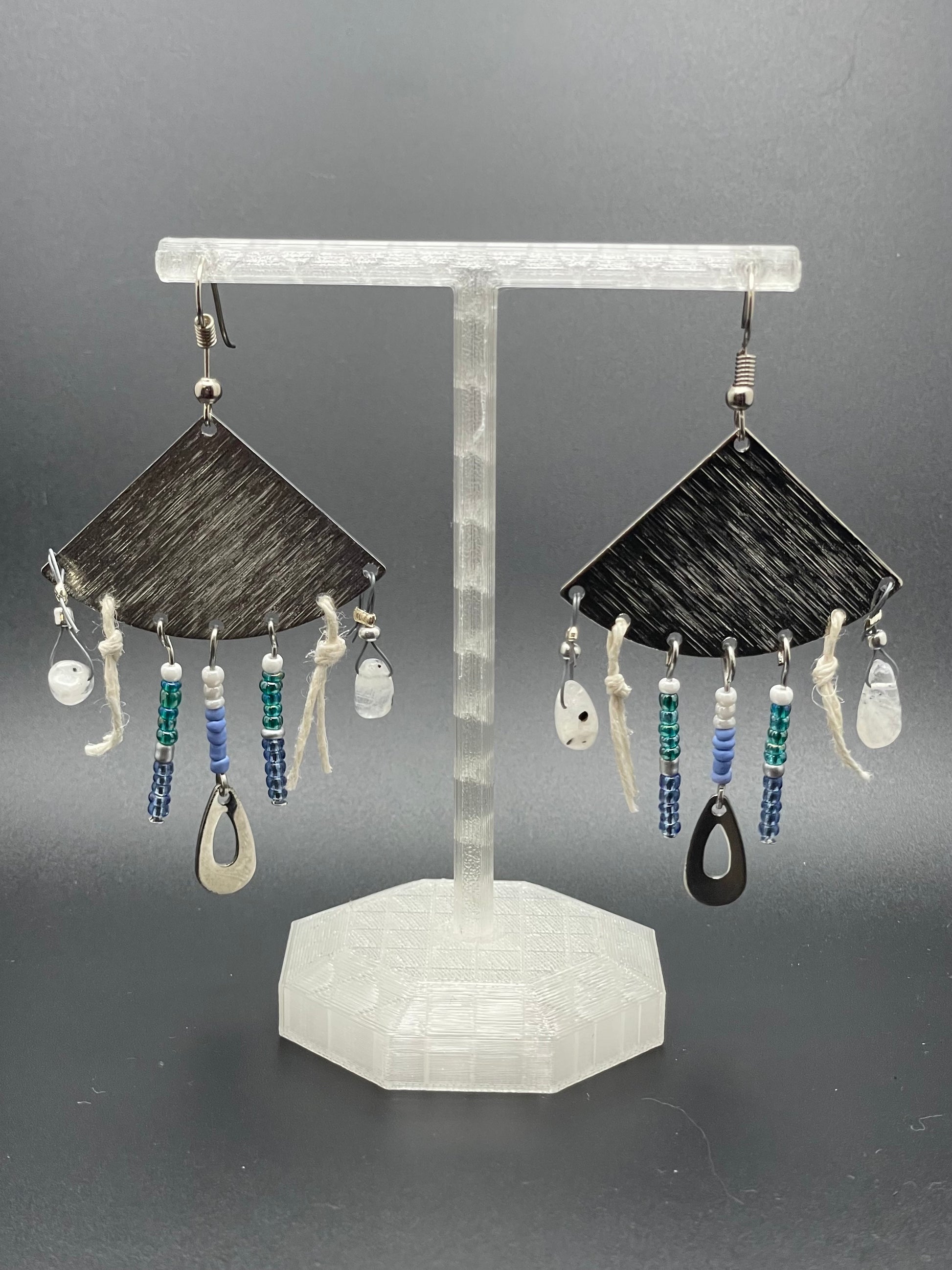 These cute earrings start out with silver wedge plates and are adorned with various beads, silver notions, and hemp strings for a boho aesthetic.